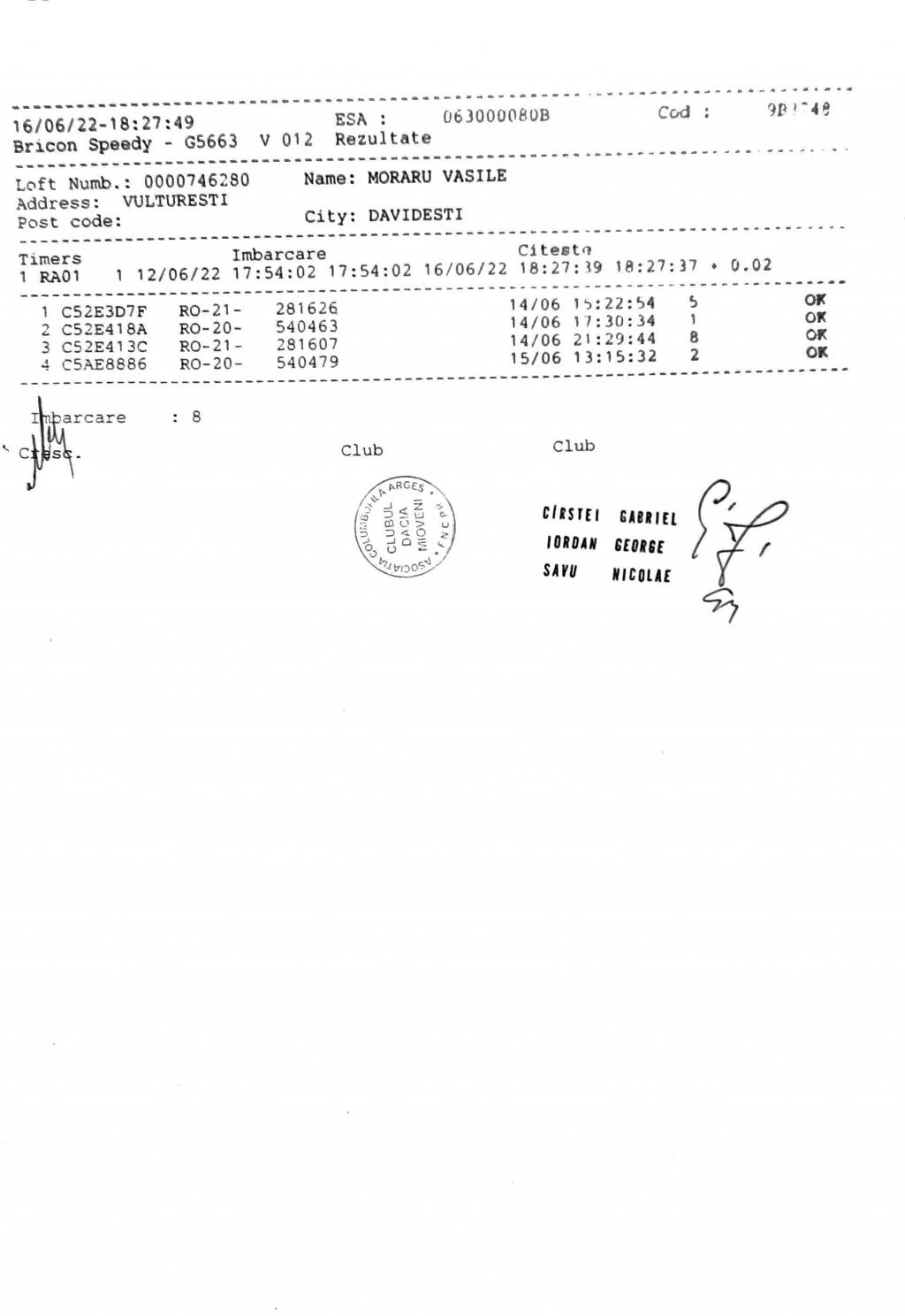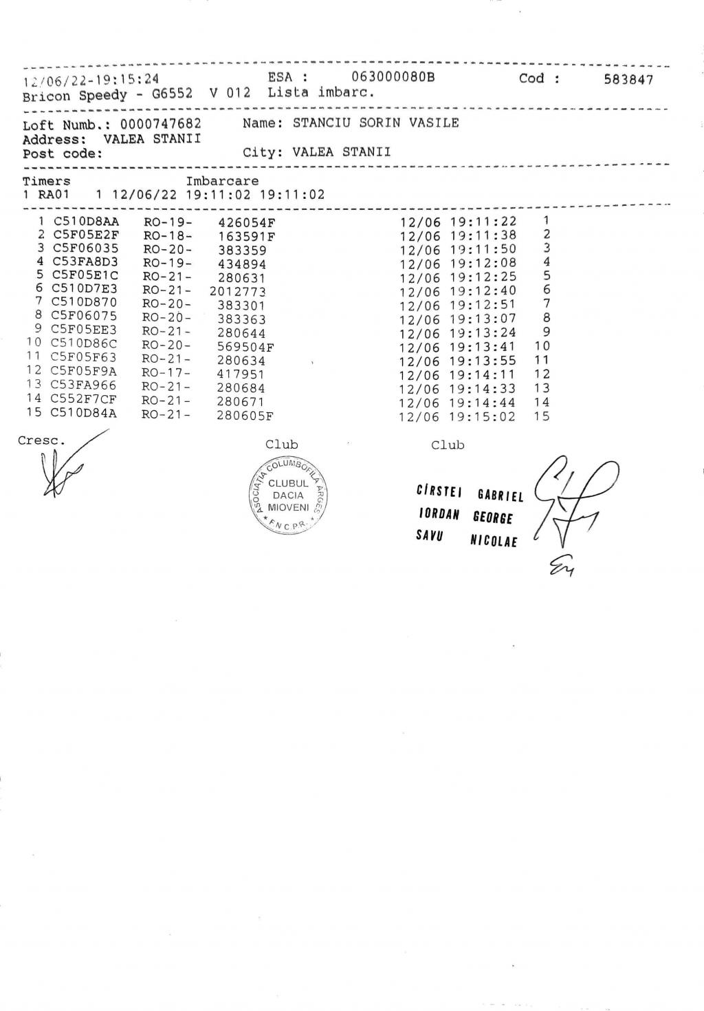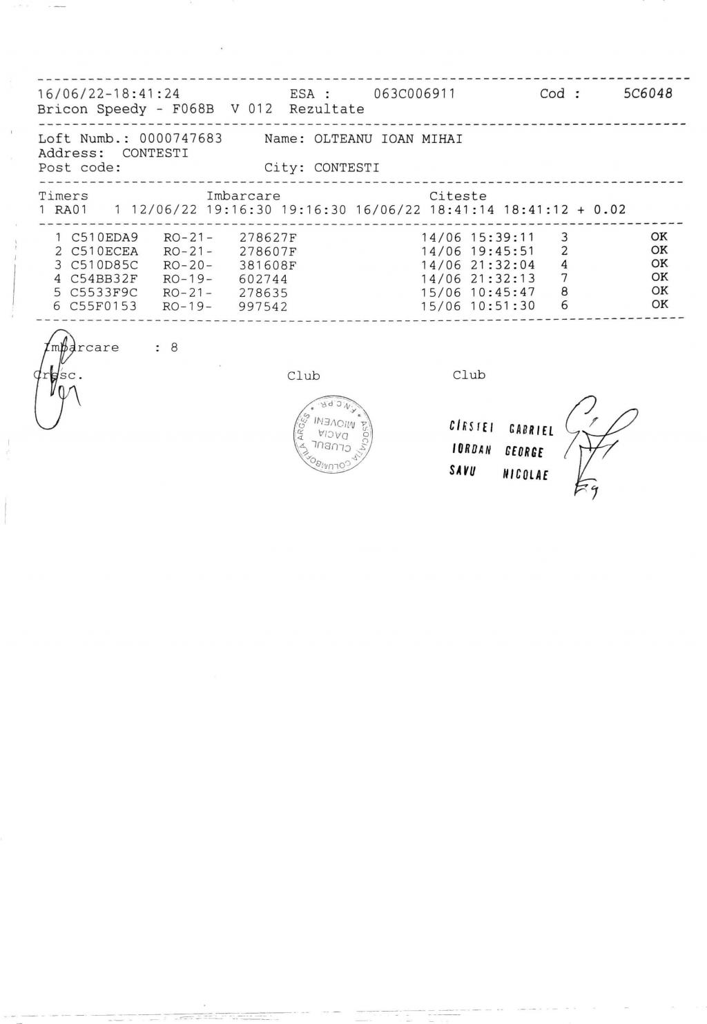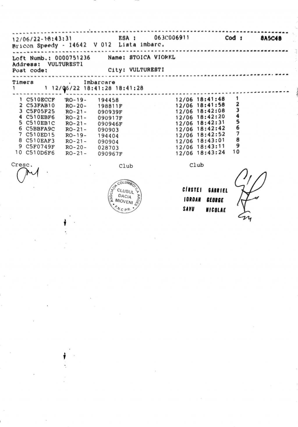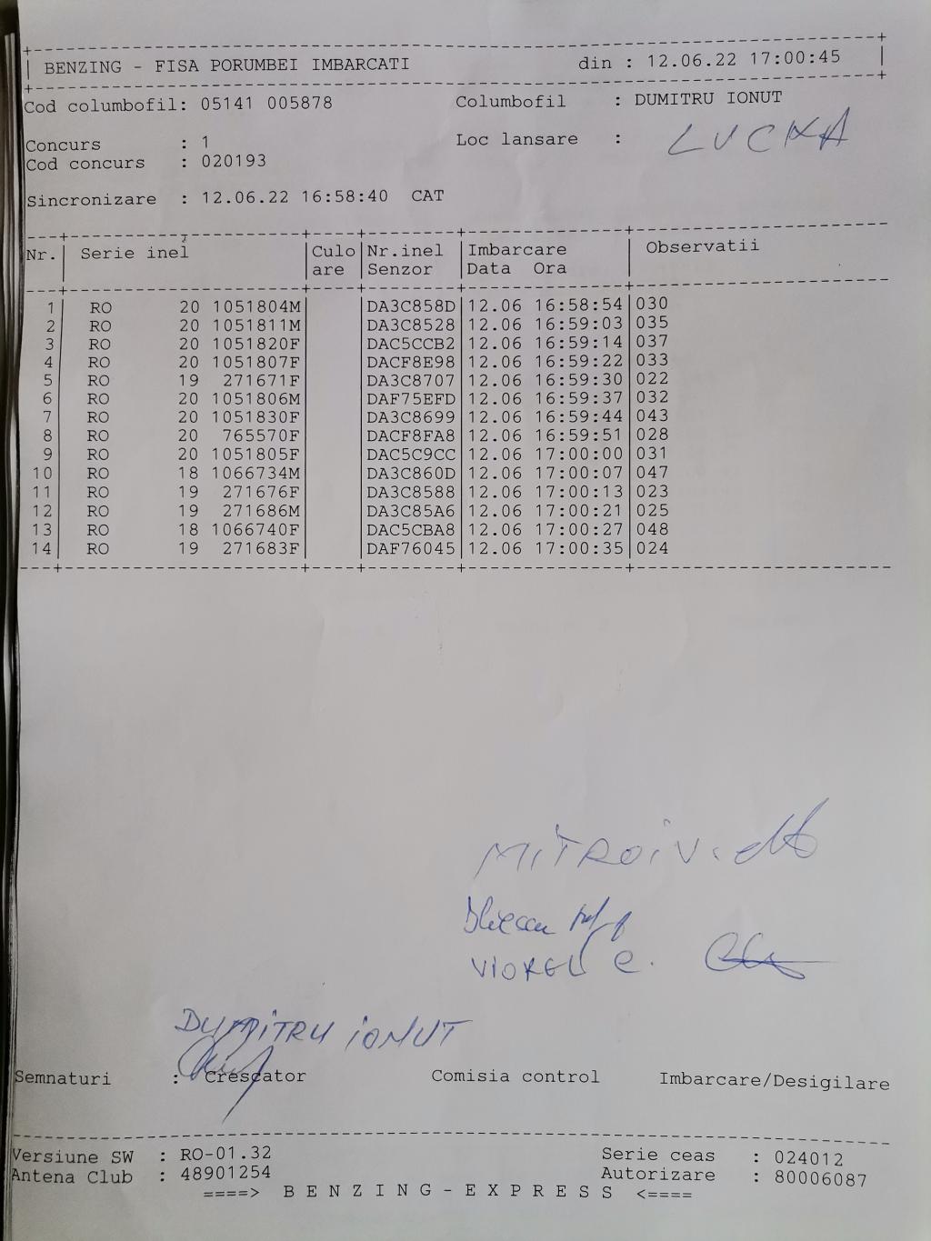 SIGILARE: [SIGILII IMBARCARE LUCKA 1] [Sigilare AG12Peu centru columbofil Furduiesti ] [Sigilare AG09POR, centrul Coste?ti, LUCKA] [Desigilare AG09POR, CENTRUL COSTE?TI, ETAPA LUCKA] [Filmare sigilii etapa Nr.1 Lucka ] [Flmare sigilii îmbarcare et.nr.1 cu lansare din loc.Lucka,Slovacia] [Filmare desigilare et.fond Lucka la C.?tef?ne?ti] [Desigilare masina centrul Mioveni] |