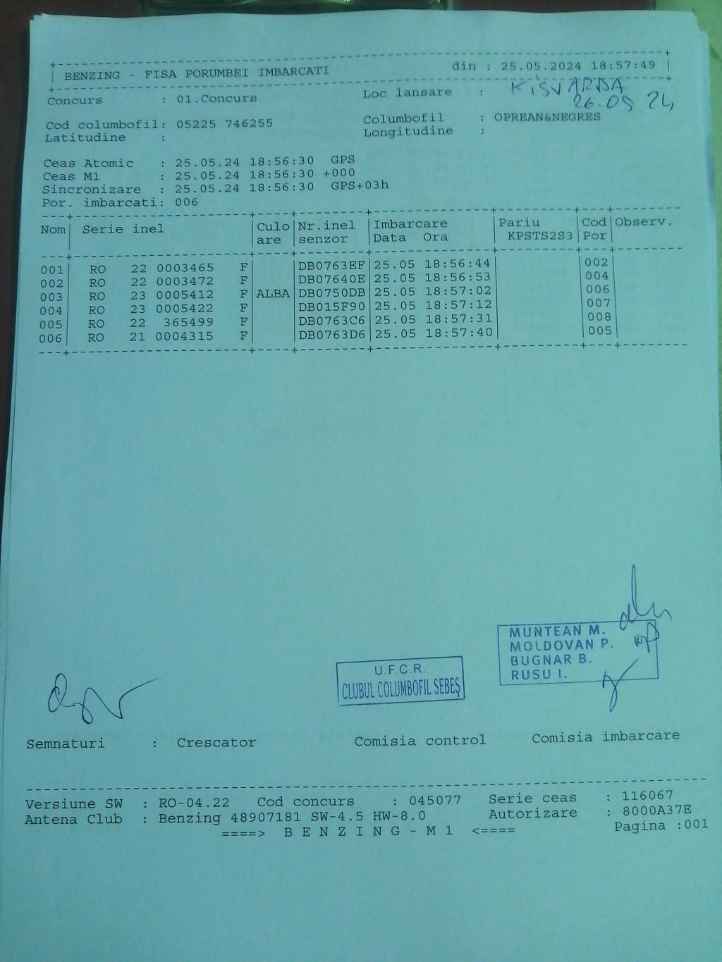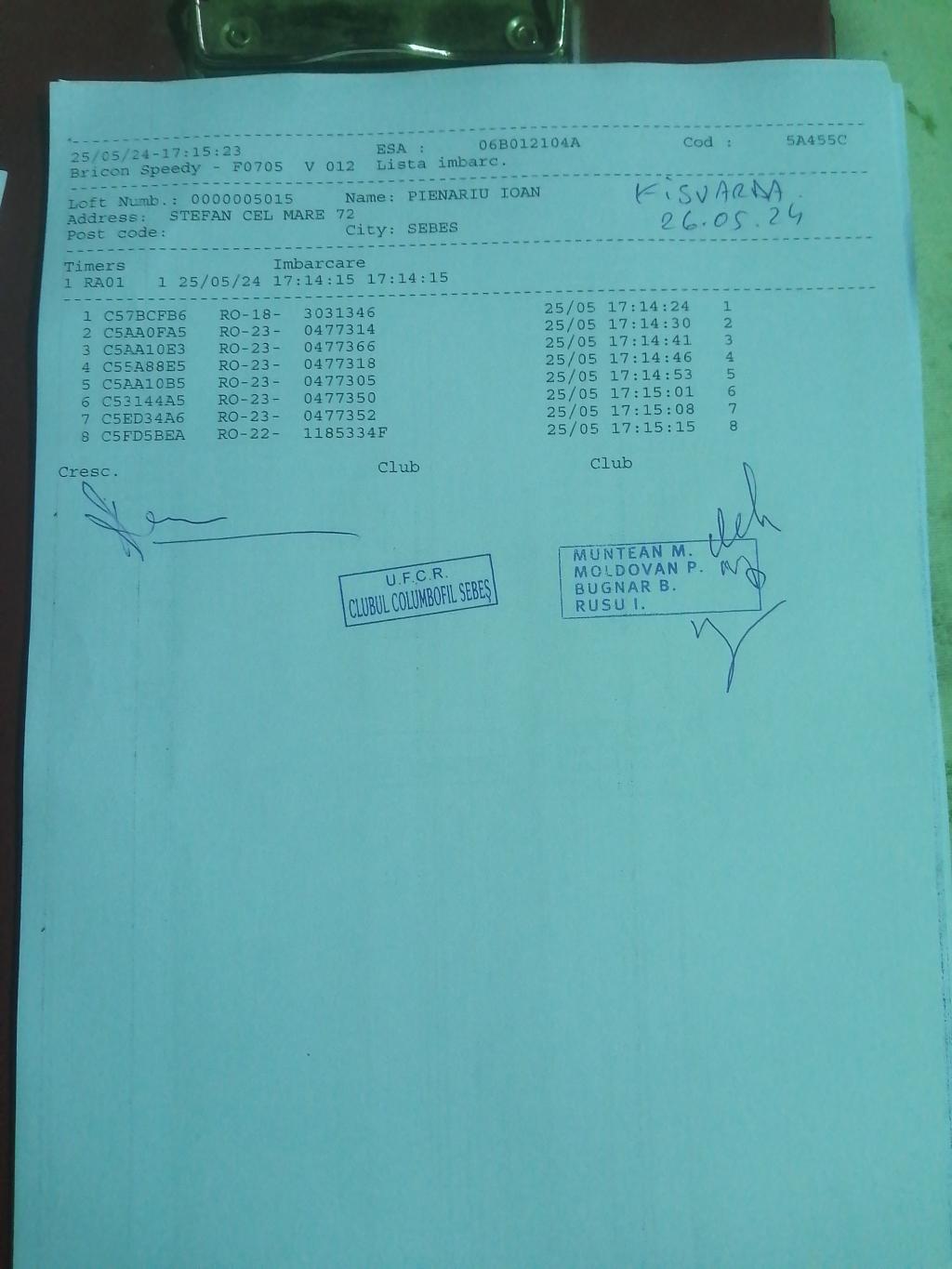 SIGILARE: [Sigilare masina centrul Cugir etapa Kiavarda] RECLEMARE: [imbarcare ordean tiberiu 2 porumbei] SIGILARE: [sigilare conc kisvarda centru sebes] [Sigilii masina de la centru Cugir] [Sigillii masina centru Alba-Iulia - final] [Citire sigilii la sosirea ma?inii de la centrul Sebe? ] [Sigilare ma?in? centru Vint concurs Kisvarda] |