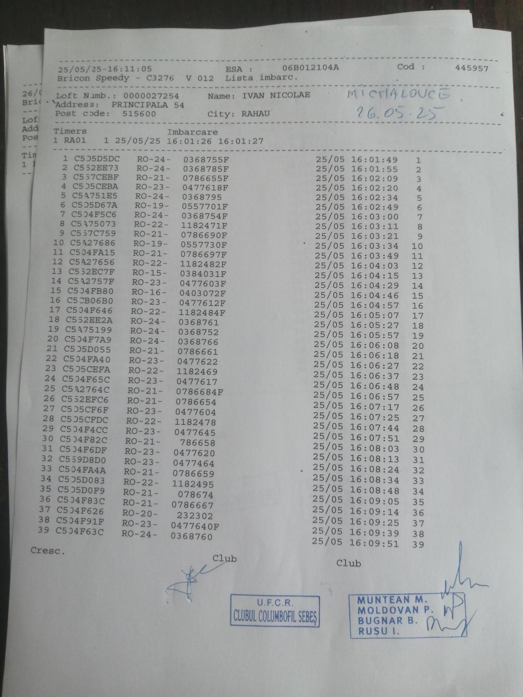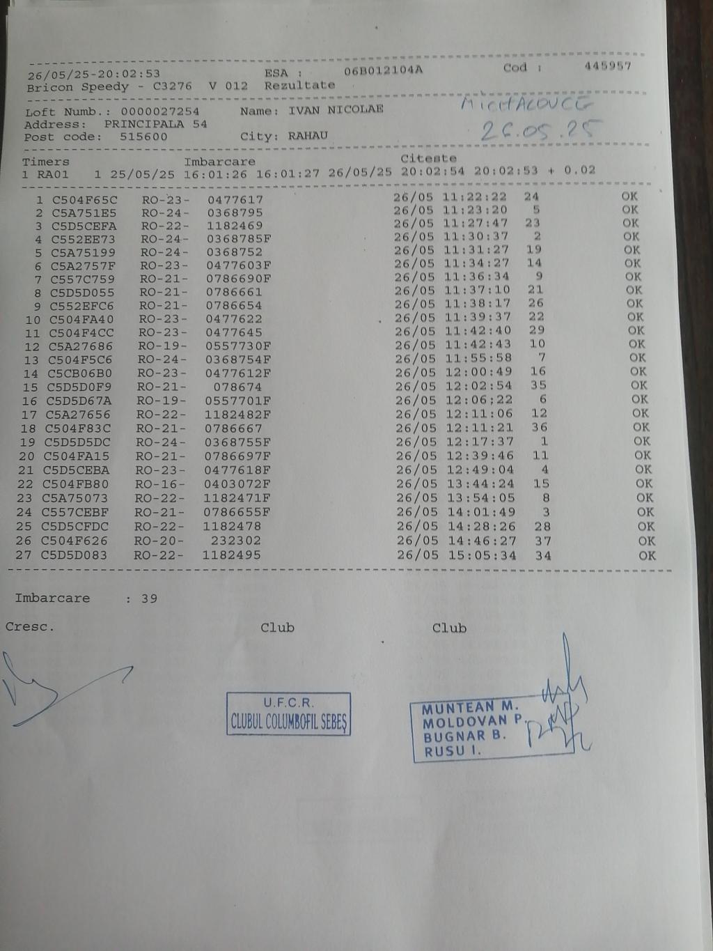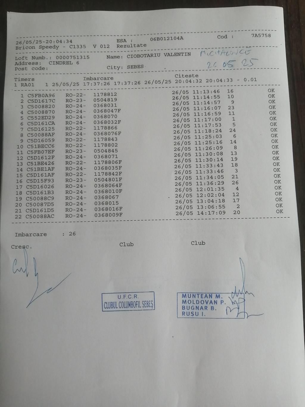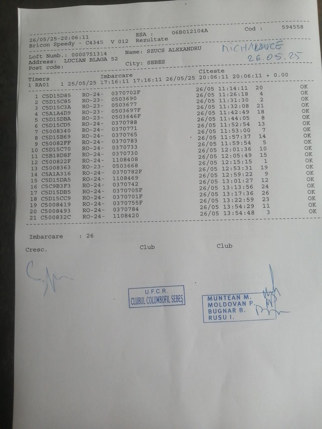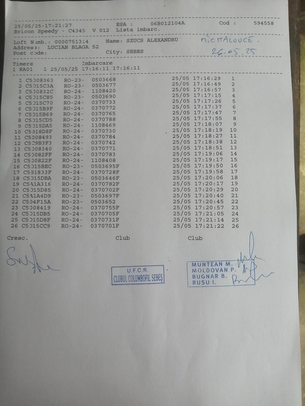 SIGILARE: [Sigilare masina Vintu de Jos etapa Mihalovce] [sosire AB03BDY de la centru vint la sebes] RECLEMARE: [imbarcare porumbel Team V.B.G RO2024 366955] [imbarcare porumbel ciobotariu valentin RO2024 368032] SIGILARE: [plecare masini AB03BDY si AB15BDY de la centrul sebes] RECLEMARE: [Sticker Roman Sergiu] [Sticker Fratii Calugar] [Imbarcare 4 porumbei Magda Ionut] SIGILARE: [Desigilare masina Centru Alba-Iulia] [Sigilare masina centru Alba-Iulia ] |
