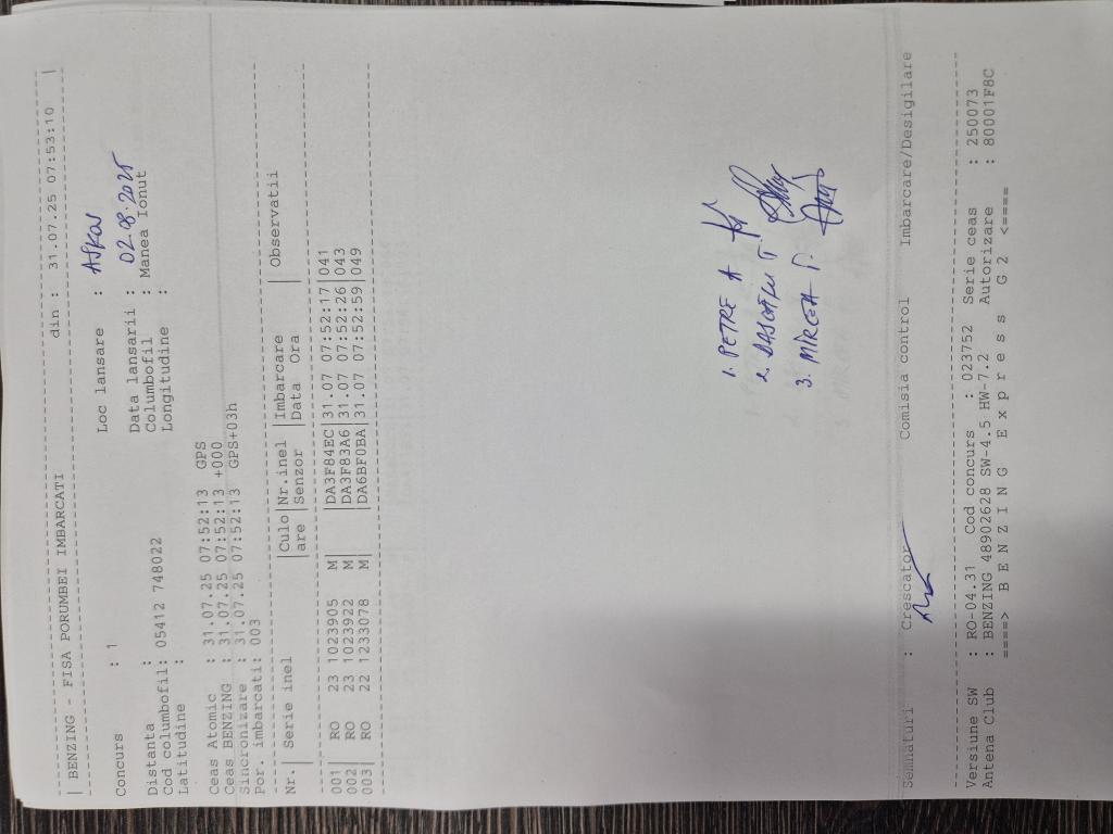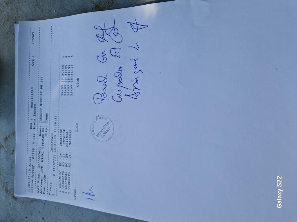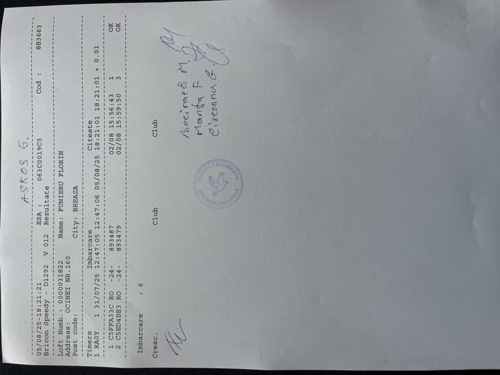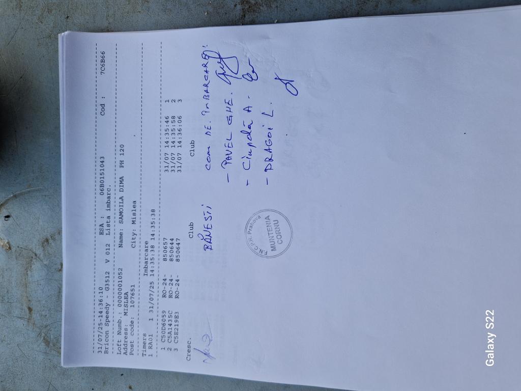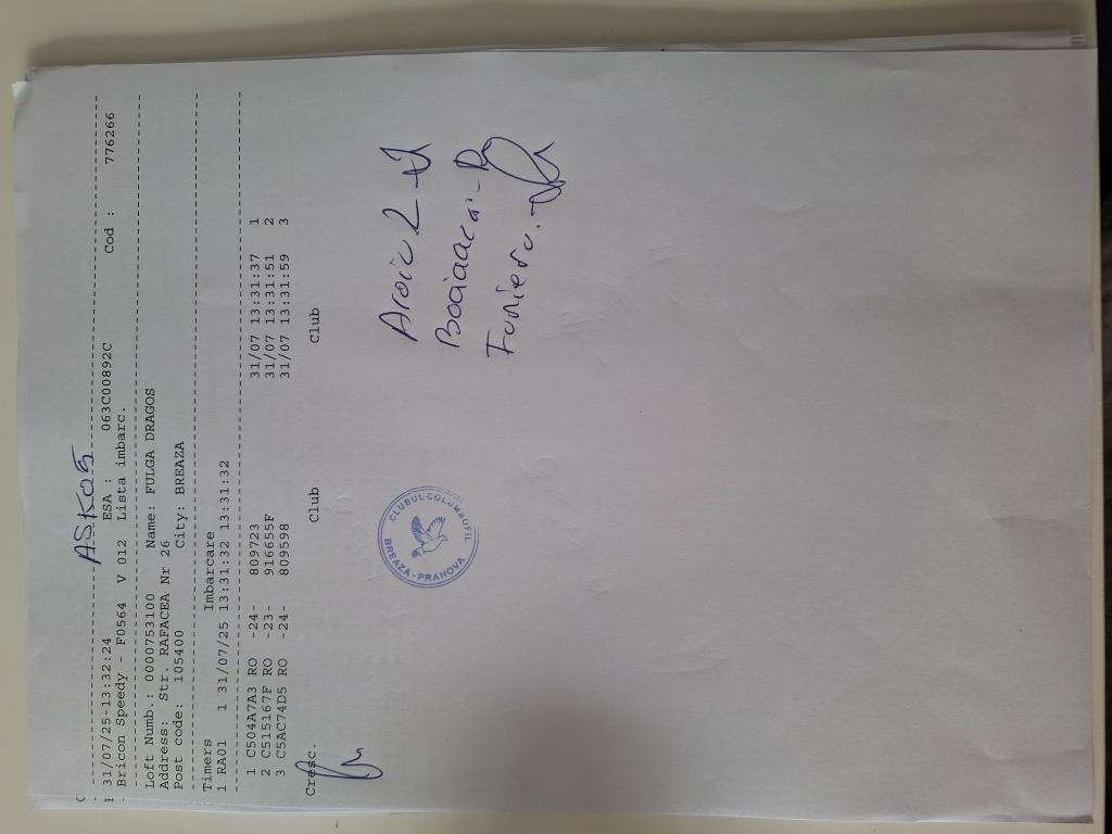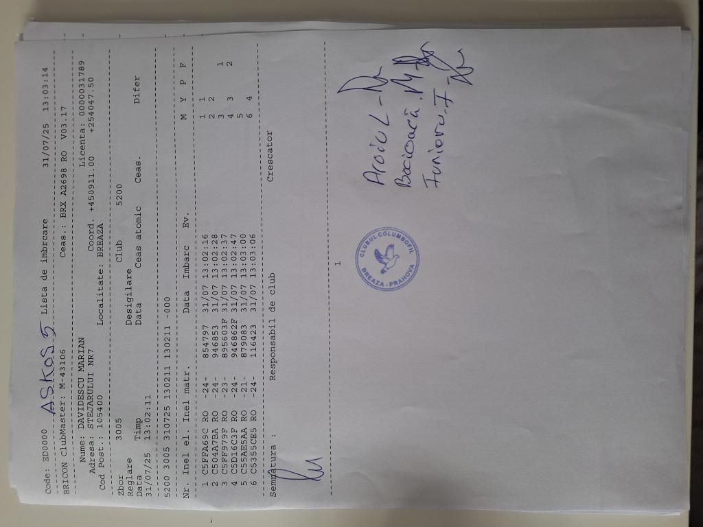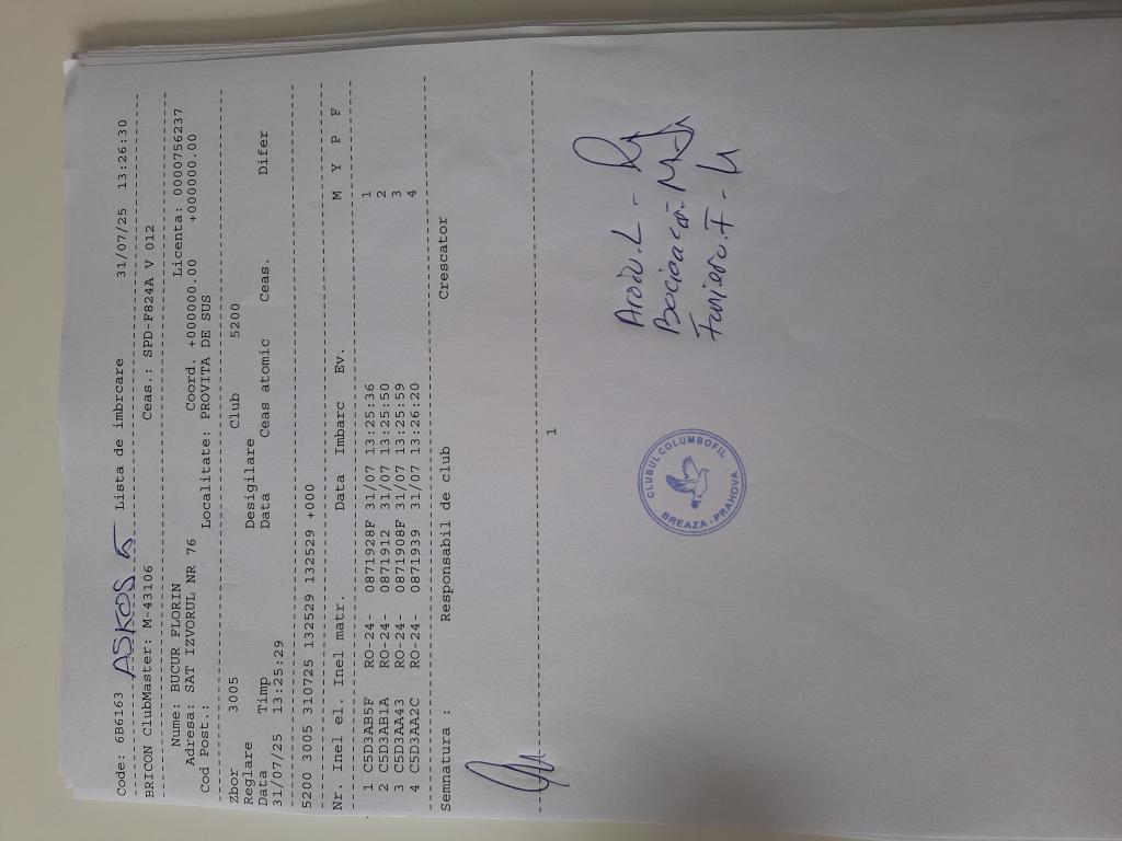 SIGILARE: [Sigilare masina la club Berca] [Desigilare masina la club Valeni] RECLEMARE: [Reclemare porumbel 860218-2024, crescator Toader Florin] SIGILARE: [Sigilare masina club Valeni] [Desigilare CC Breaza] [Sigilare CC Breaza] RECLEMARE: [reclemare control Sima Dorin] SIGILARE: [imbarcare Cornu] [desigilare Cornu] [desigilare Plopeni] [sigilare Plopeni] [Sigilare masina la club Urlati] [Desigilare masina la club Urlati] |