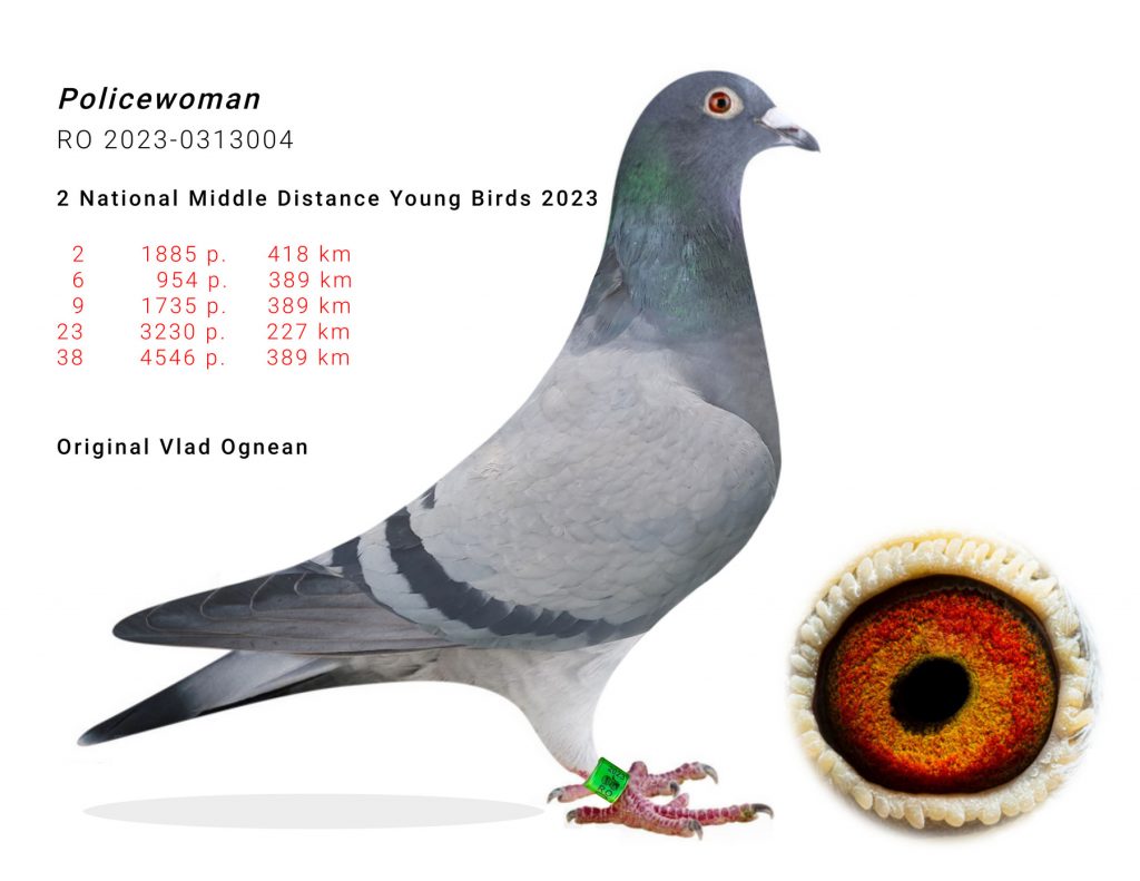 Dintre cei trei performeri ai anului 2023 îl avem pe 2017283-2023, campion național al categoriei General Pui, un pui cu părinți 100% reproduși în crescătoria mea, mama lui fiind campioana națională a aceleiași categorii, în anul 2017. Nu a fost un pui de bază pentru echipă, însă a fost performerul sezonului, fără dubii. Apoi avem puiul cu seria 313004-2023, locul 2 național Demifond Pui, femelă originală Vlad Ognean, și puiul cu seria 2017299-2023, locul 3 național Demifond Pui, având ca tată un alt campion național la categoria As Național 2018, <<Thor Gut>>, concurat de alt bun prieten columbofil, Sergiu Stoin, hibridat însă cu o femelă de maximă calitate, zburată în Belgia, de către campionul Belgiei de anul trecut al categoriei Fond Pui, Hok van den Bruel.