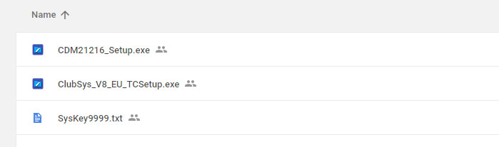 (CDM212364_Setup.exe este driverul necesar trapei conectate la un port USB; ClubSys_V8_EU_10Setup.exe instalabilul softului ClubSys; SysKey9999.txt contine parola de acces in program, la fiecare deschidere a acestuia)